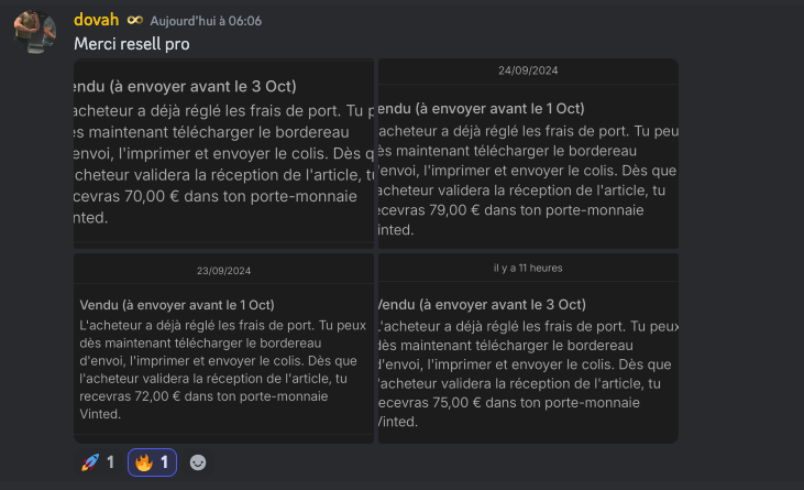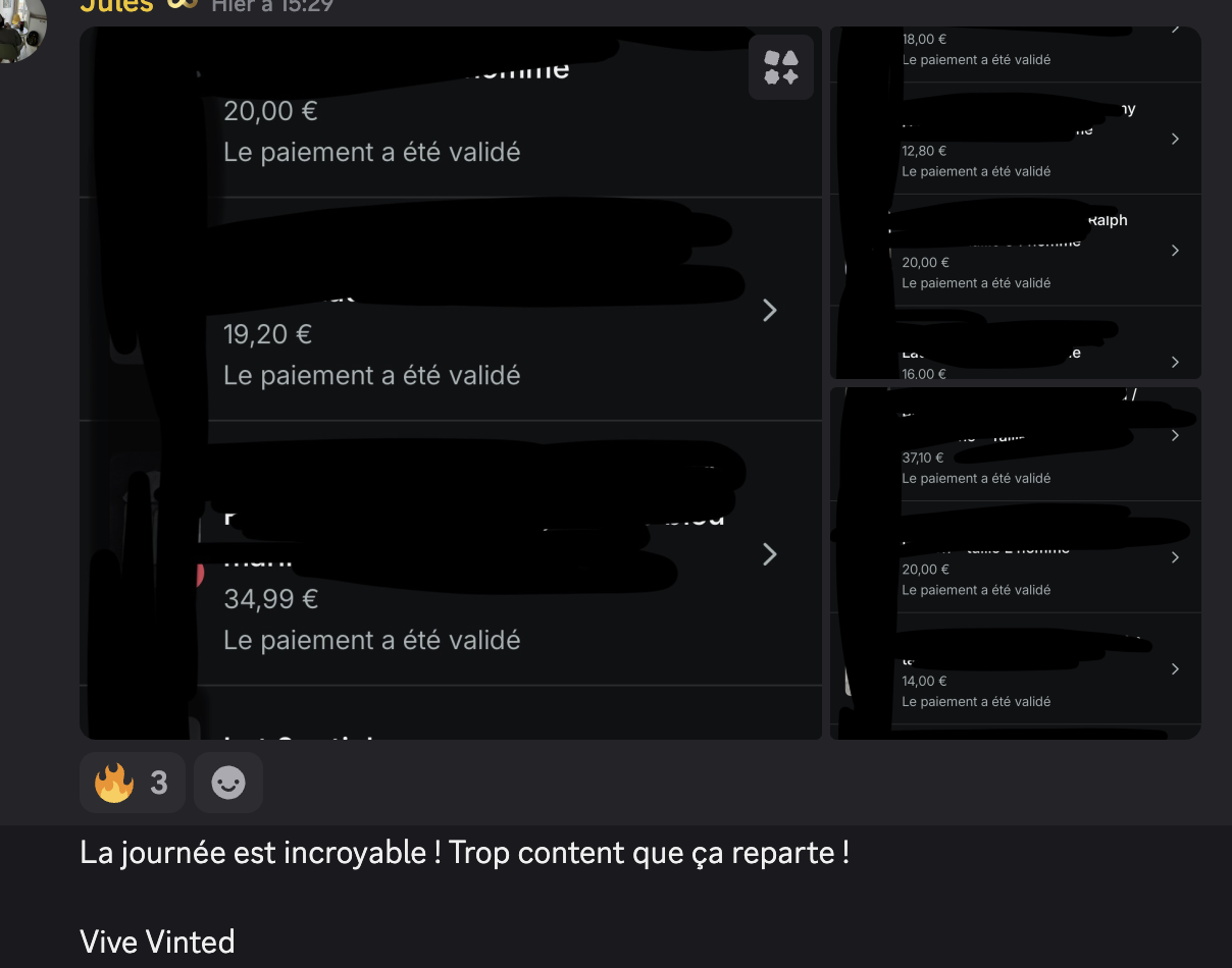 Nous faisons également des lives ou nous analysons les comptes Vinted des membres. Ce qui les aides à corriger leurs erreurs, donc à augmenter leurs ventes.