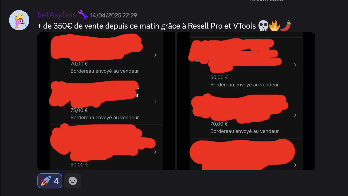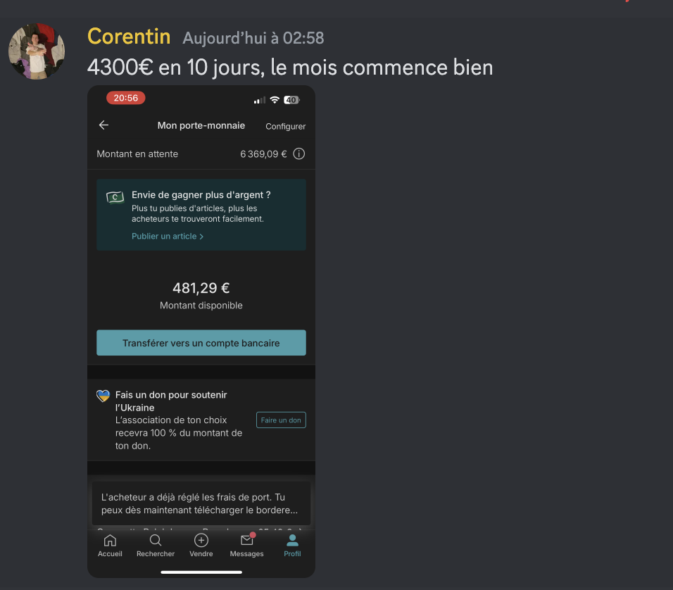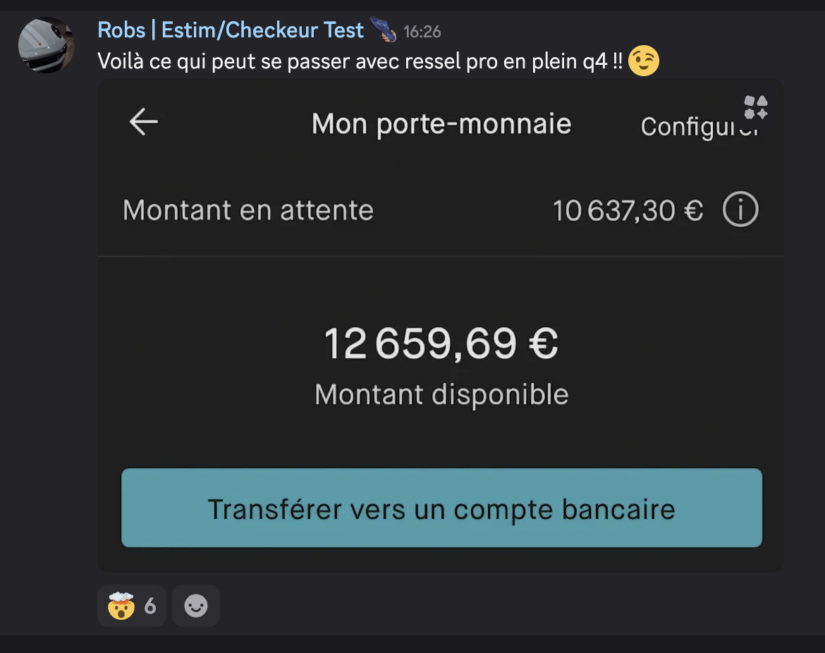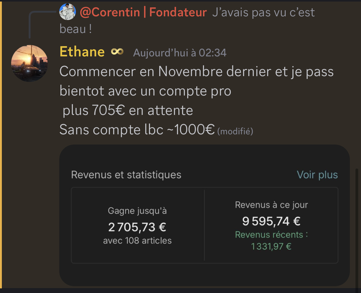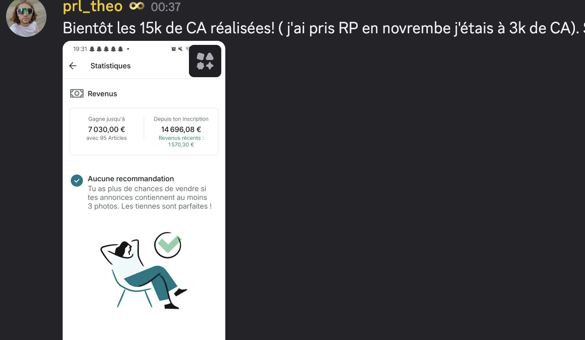 Certains membres font plus de 10 000 € de chiffre d'affaires. Ils sont également dans Resell Pro, et tu pourras bénéficier de leur expertise.